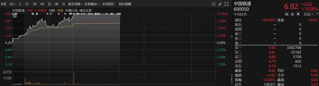 三大电信运营商大涨,中国联通涨停;中国电信涨停,再创历史新高;中国移动涨逾4%。