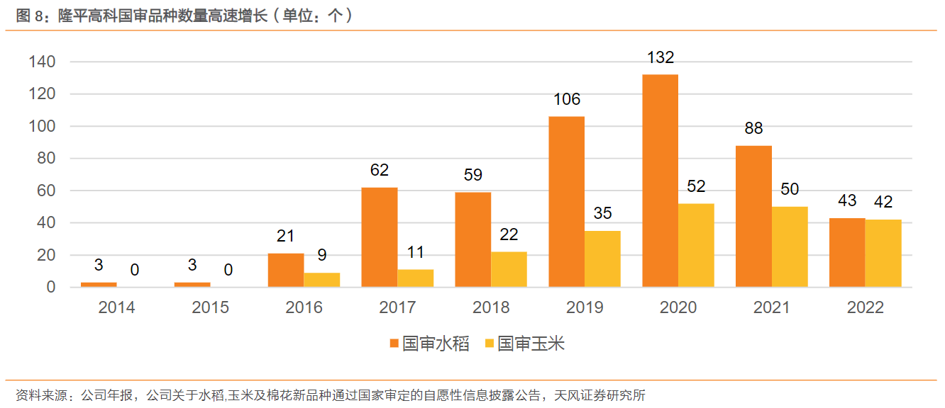 研报菌简评:公司通过不断的研发,新品种的开发持续推进,2022年国审水稻品种达43个、国审玉米品种达42个。