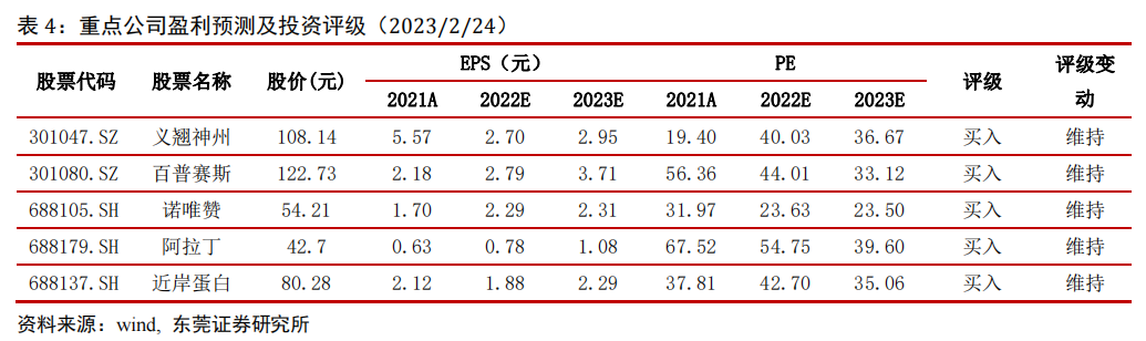上市公司投资机会方面,义翘神州是国内蛋白类生物科研试剂龙头。公司主要向客户提供包括重组蛋白、抗体、基因和培养基等产品,以及重组蛋白、抗体的开发和生物分析检测等服务,目前生产和销售的现货产品种类超过5.2万种。