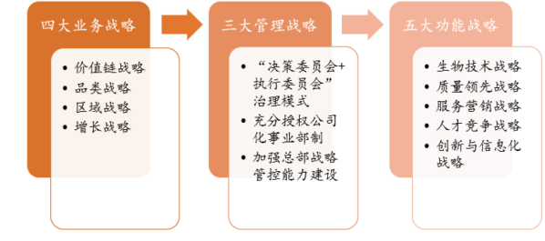 公司现已进入世界种业前十强,依托着“价值链战略、品类战略、区域战略、增长战略”四大业务战略,“总部管控、事业部制、决策委员会+执行委员会”三大管理战略,生物技术战略等五大功能战略,通过“种业运营+农业服务、国内市场+国际市场”四轮驱动,“内生发展+外延并购”双动力续航。