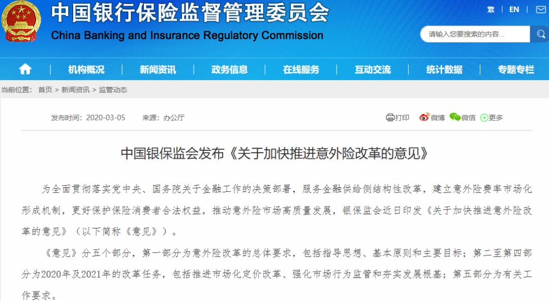 为建立意外险费率市场化形成机制,更好保护保险消费者合法权益,推动意外险市场高质量发展,3月5日,银保监会印发《关于加快推进意外险改革的意见》(以下简称《意见》),明确2020年及2021年意外险改革任务,并拟于近期针对搭售和捆绑销售、手续费畸高等乱象组织开展意外险市场清理整顿工作。