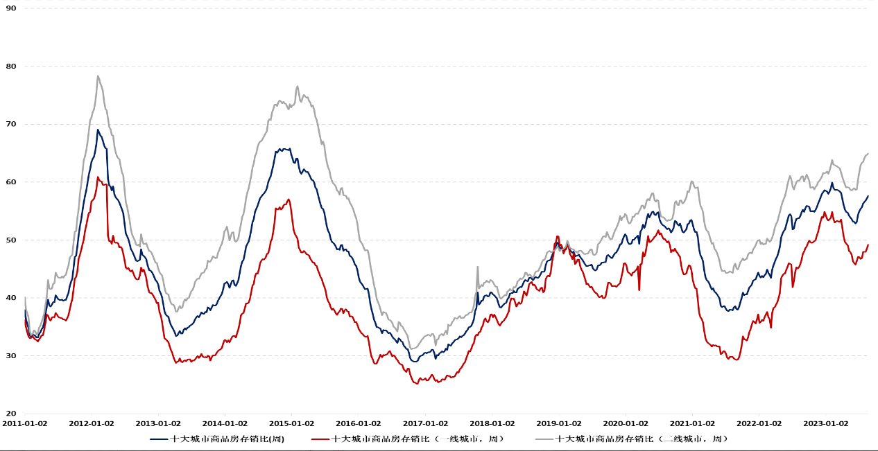 这种统计口径较现房库存更宽,更加具有代表性。目前,中义房地产库存存销比略高于历史均值,一二线城市总体库存存销比为58周。细分一线城市与二线城市,一线城市库存存销比的销售周期为49周,二线城市库存存销比的销售周期为65周。考虑到近期销售萎靡,存销比短期走高不可避免,但是存销比的绝对数值远低于2012年和2014的房地产衰退期。