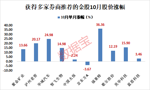 从行情表现来看,这138只金股自10月以来,股价平均上涨5.39%,跑赢同期大盘。其中,爱美客的股价在10月单月上涨45.95%,涨幅最大。福莱特、石头科技、洋河股份、稳健医疗、新宙邦的10月股价涨幅均超过30%。