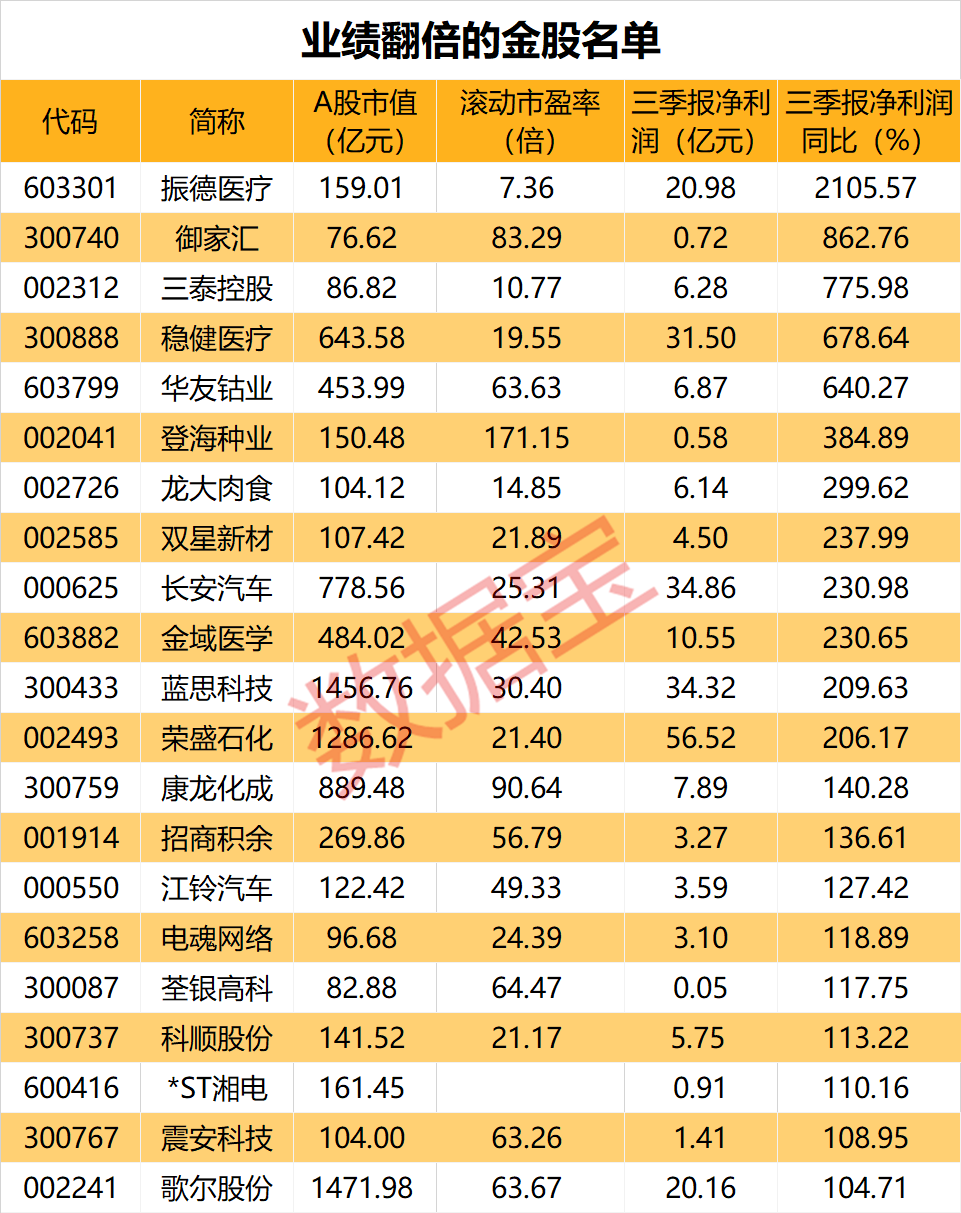 此外,券商推荐的御家汇、三泰控股、稳健医疗、华友钴业、登海种业、金域医学等股的业绩同比增长幅度均超100%。