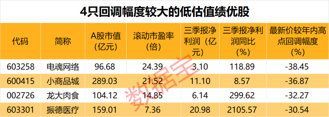 此外,从股价回调幅度上来看,最新收盘价较年内高点回调幅度超30%的绩优且低估值股票仅有4只。分别是电魂网络、小商品城、龙大肉食和振德医疗。宝通科技、精工钢构、科顺股份、奥佳华和常熟银行等股业绩亮眼的同时,股价回调幅度均超过25%。