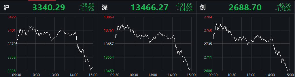 截至今日收盘,上证指数跌1.15%,报3340.29点;深证成指跌1.4%,报13466.27点;创业板指跌1.7%,报2688.7点;科创50跌2.85%。