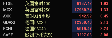 欧洲股市亦是全线造好。截至发稿时间,欧洲主要股指上涨皆接近或超过2%。