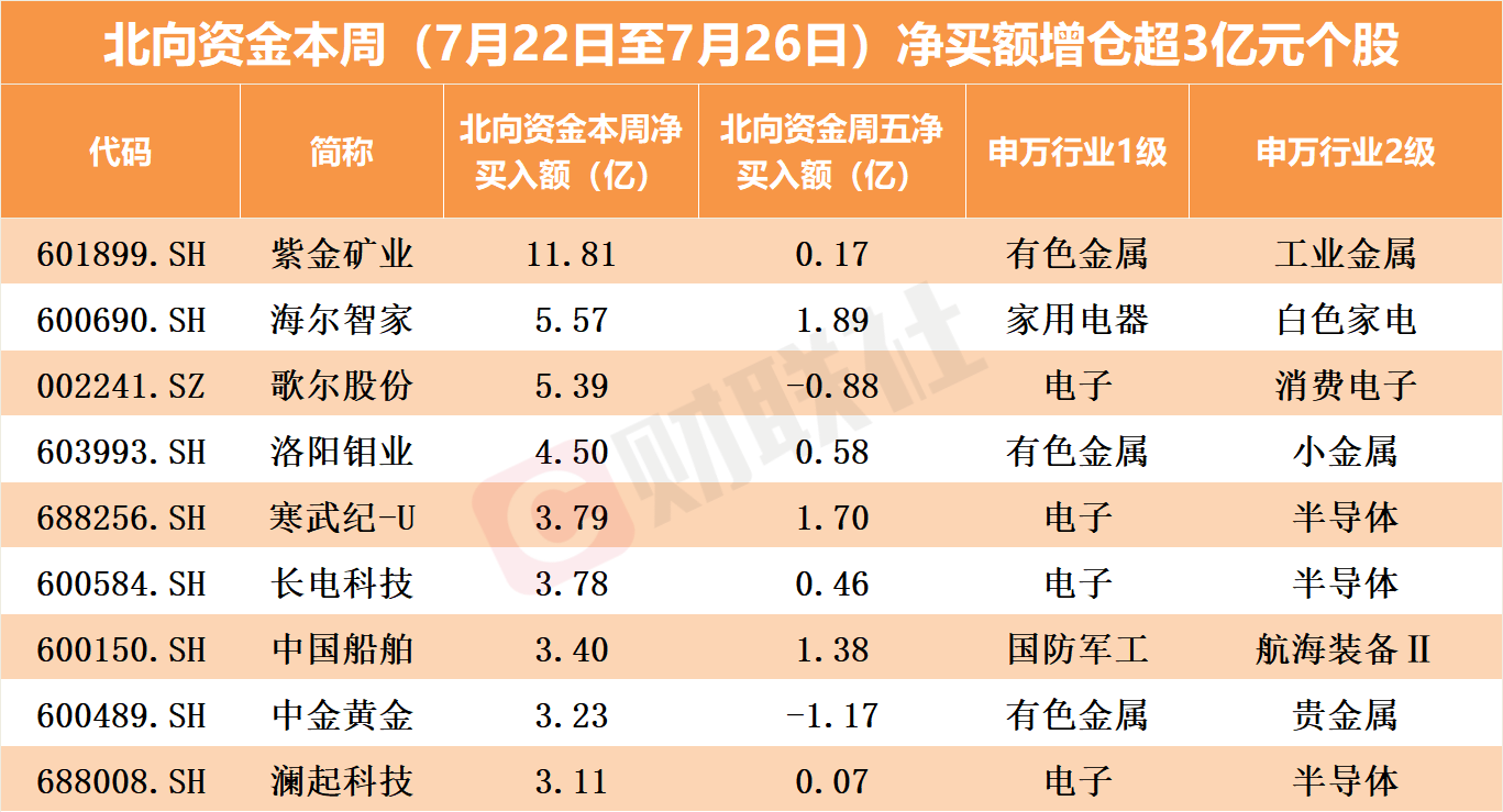 从周度(7月22日至26日)表现看,北向资金周净买额累计超3亿元的个股见下表。具体来看,紫金矿业净买入额为11.81亿元,海尔智家、歌尔股份、洛阳钼业加仓额均超4亿元。