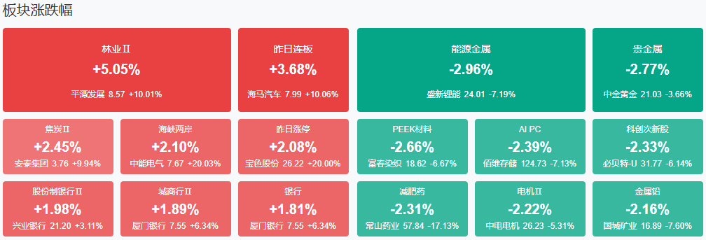 市场早盘震荡调整,深成指、创业板指均跌超1%。沪深两市半日成交额1.22万亿,较上个交易日缩量1648亿。盘面上热点较为杂乱,全市场超3700只个股下跌。从板块来看,福建板块逆势上扬,平潭发展13天10板,福龙马等10股涨停。半导体设备股震荡反弹,中微公司涨超7%。煤炭板块反复活跃,安泰集团14天8板。下跌方面,机器人概念股集体下跌,安培龙、拓普集团等多股大跌。创新药概念震荡调整,常山药业一度逼近跌停。黄金概念股多股下挫,潮宏基持续走弱。