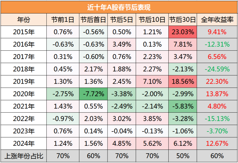 浙商证券1月27日发布研报表示,国内宏观政策积极发力,经济基本面边际改善,再叠加外部风险阶段缓和,为A股市场演绎创造了较为有利的环境,节后大盘有望延续当下的结构性修复行情。Choice数据显示,统计过去10年上证指数节后表现可以看到,节后5日和10日的A股上涨概率达到了70%。