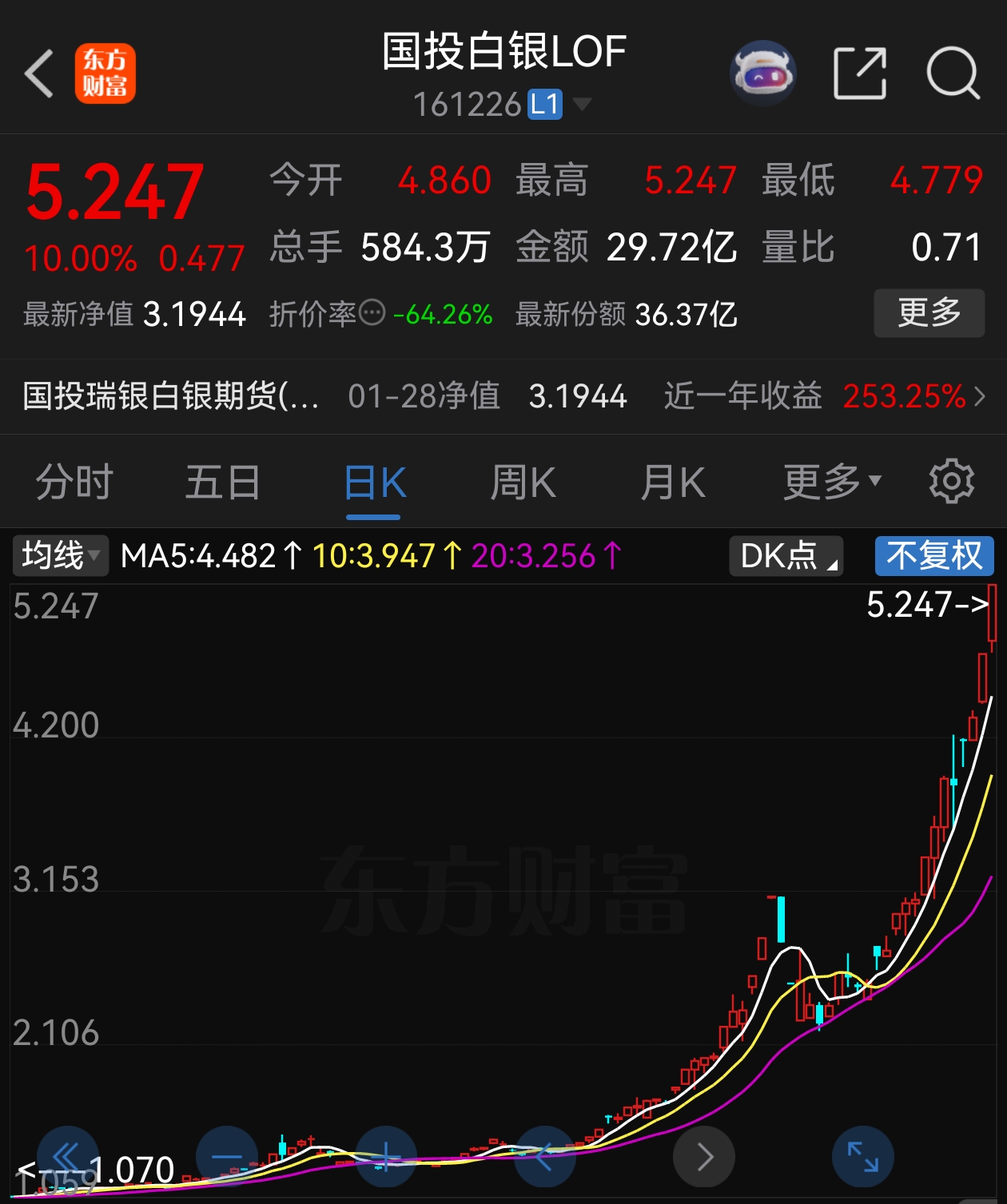 值得一提的是,国投白银LOF于1月28日起暂停申购(含定期定额投资)业务。该基金在二级市场已连续两个交易日涨停,今日报收5.247元/份,相较于其最新披露的净值(1月28日净值为3.1944元)溢价64.26%。