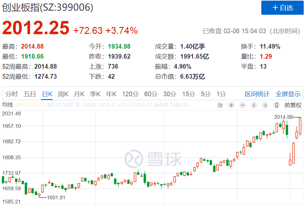 今日(2月6日),A股三大股指再度齐齐走高,两市上涨家数超3000家,251只个股涨停,截至收盘,上证指数、深证成指、创业板指分别上涨1.72%、2.87%、3.74%。