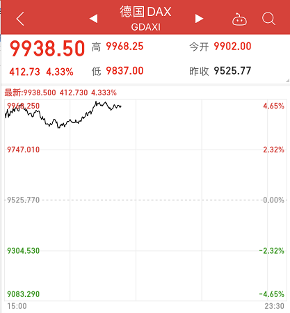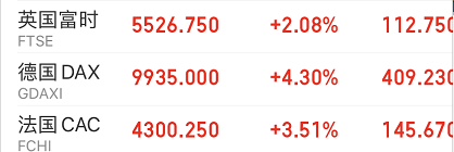 目前(北京时间18:30左右)正在交易的欧洲股市继续大涨,英国股市涨逾2%、德国更是大涨超4%,法过涨逾3%。