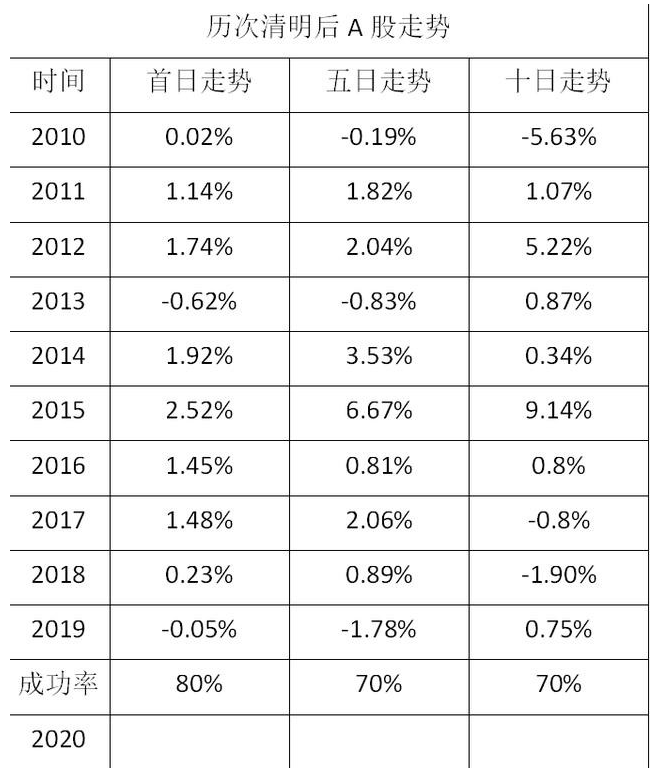 根据晓宁说股的统计,2010年-2019年最近10年清明节后,A股首日上涨概率高达80%。