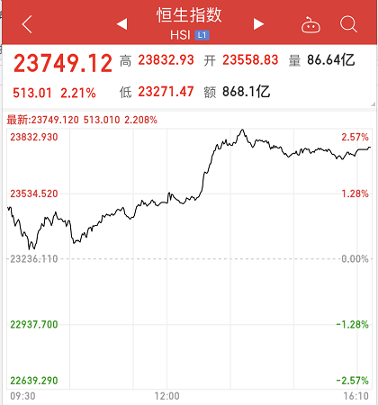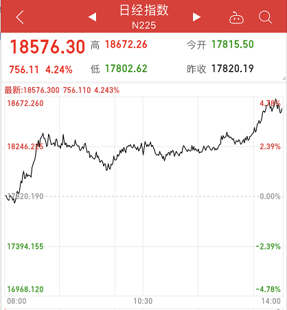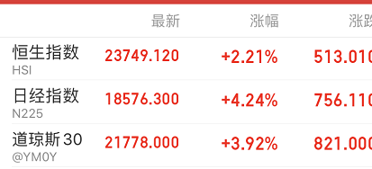今日开盘交易的亚太股市中,港股、日股、韩股全线暴涨,恒生指数大涨2.21%,日经指数暴涨4.24%,韩国综指大涨3.85%。