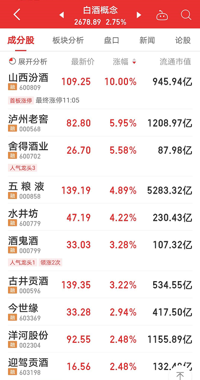 值得一提的是,在今日剧烈波动的过程中,酿酒板块早盘全程抗跌,山西汾酒率先涨停,最新股价109.25元,创下历史新高。白酒行业龙头泸州老窖、五粮液分别大涨5.95%、4.89%,贵州茅台则再次刷新A股纪录,最新股价1292.88元。