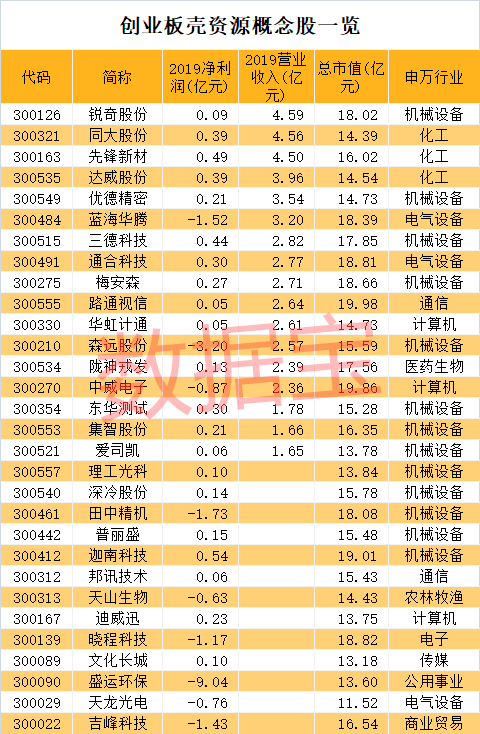 此外,创业板壳资源概念价值随着注册制度的推出,或将大幅降低。数据宝从市值、营收(2019年年报未披露的,以2018年为准)等角度,统计出部分创业板壳资源概念股。(数据宝 梁谦刚)