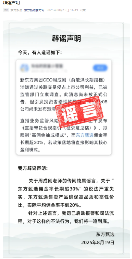 盘后,东方甄选发布声明称,关于周成刚老师的传闻纯属谣言,关于“东方甄选佣金率长期超30%"的说法严重失实,东方甄选售卖产品确保高品质和高性价比,实际平均佣金率不到20%。针对谣言,已启动报警和司法流程,对于这样的不法行为将一追到底。