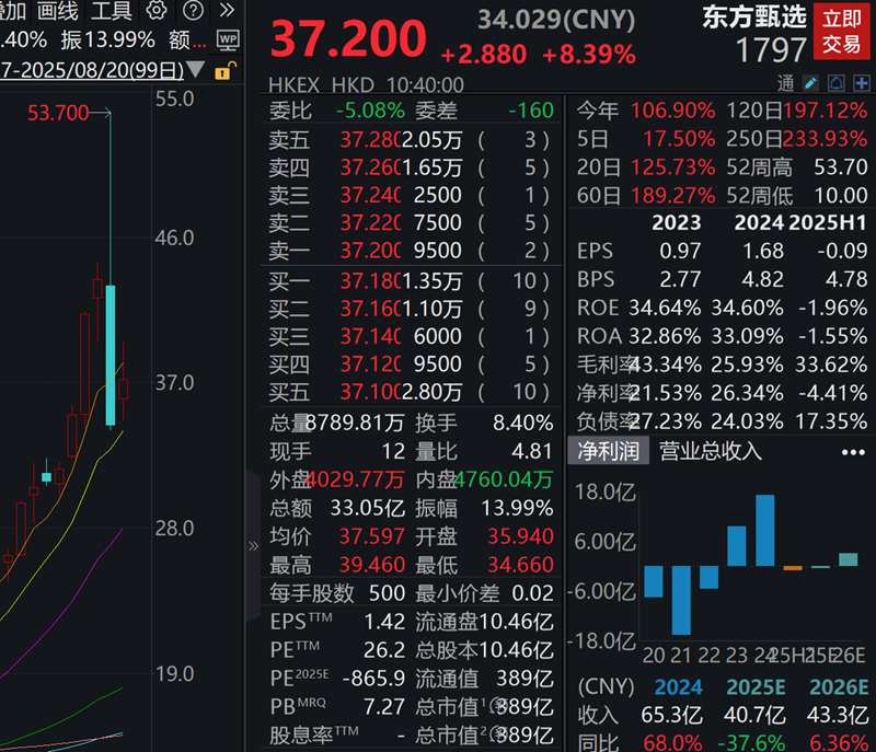 8月20日,港股东方甄选一度涨超14%,截至发稿,该股张超8%,报37.2港元。