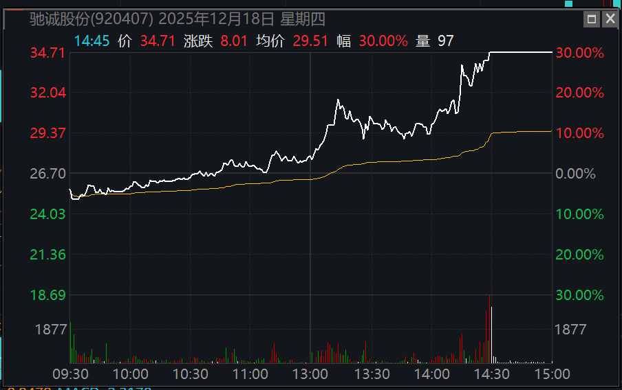 12月18日盘后,驰诚股份发布了股票交易异常波动公告。公告称,公司股票最近3个有成交的交易日2025年12月16日至2025年12月18日以内收盘价涨幅偏离值累计达到 41.17%,根据《北京证券交易所交易规则(试行)》的有关规定,属于股票交易异常波动情形。