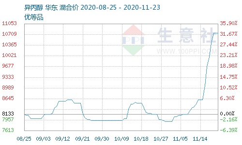 生意社消息,据大宗商品数据监测显示,本周内异丙醇价格上调。上周末国内异丙醇均价为8600元/吨,本周末均价为10700.67元/吨,周内价格上调,幅度为25.15%。