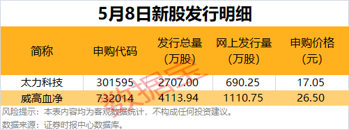 今日(5月8日)共有2只新股申购,分别为沪市主板的威高血净,创业板的太力科技。