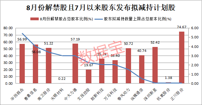数据宝统计显示,7月1日以来首次公告减持计划,且8月份即将解禁股有13只。从这13家公司股东减持数量上限占总股本比例来看,华扬联众拟减持比例上限最高,达到5.43%,其次的赛易信息、南卫股份及天赐材料均超过3%,而正川股份、杭氧股份及深圳新星均不到0.1%。但相较于解禁股占比,减持股数量占比都很低。比如华扬联众解禁股占比接近57%,赛易信息解禁股占比超过56%。