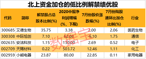 数据宝统计显示,在以上111只解禁股中,解禁股占比低于50%,且7月份获北上资金加仓的中报绩优股仅有5只,包括2只科技股:5G概念股中际旭创及安洁科技。除天赐材料外,其余4股尚未发布股东减持计划。