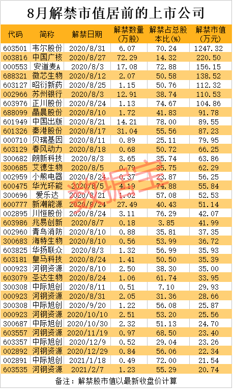 另外,安道麦A、微芯生物、昭衍新药等5股解禁市值均超过百亿。值得警惕的是,安道麦A、苏州银行、华扬联众等股将在8月份首个交易日迎来解禁。