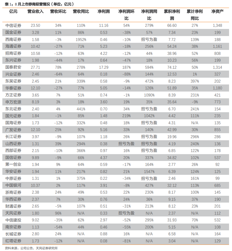 据天风证券统计,统计范围内的32上市券商8月营收183亿元,与上月基本持平,同比+109%;实现净利润76亿元,同比+299%,环比+17%。