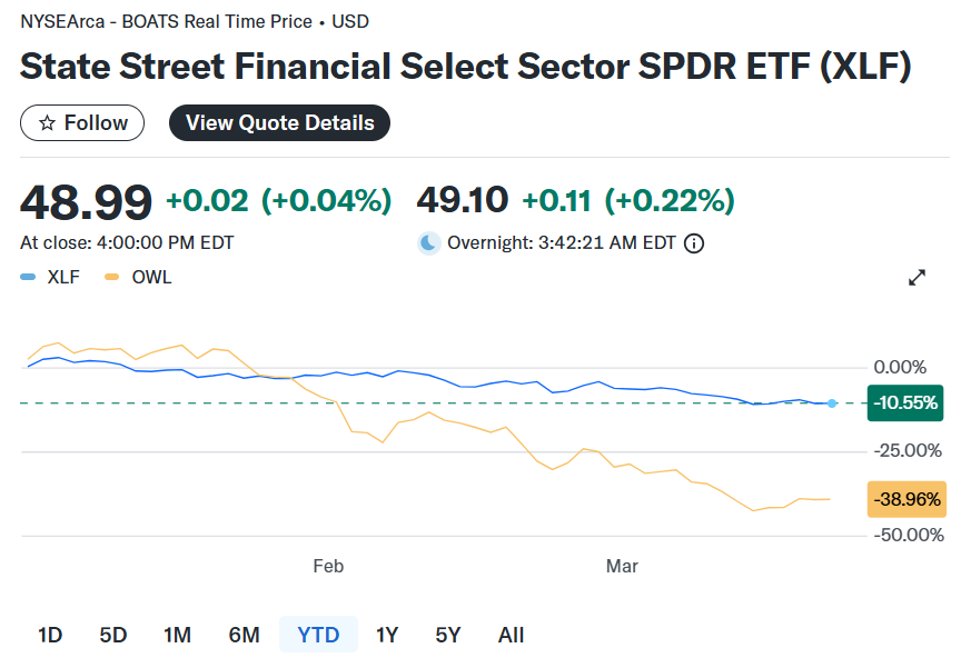 Blue Owl的股价今年以来已下跌近 40%,而同行兼长期以来最强竞争对手Ares Management(ARES.US)同期下跌34%。Blue Owl作为一家向私营企业放贷的另类金融巨头,在投资者们对私募信贷担忧加剧之际,其股价在地缘政治冲突催化之下甚至即将相对峰值而言“腰斩”。