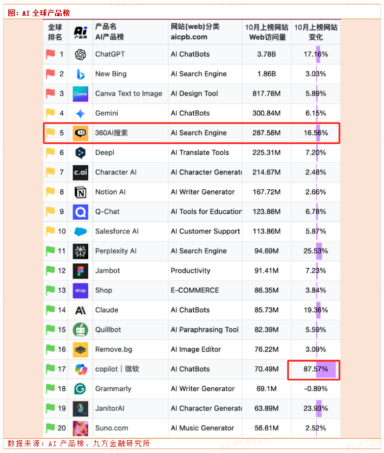 10月,AI应用产品榜月度数据狂飙,国产AI应用同比增速亮眼。AI全球榜中,360AI搜索10月Web访问量居于全球第5,全国第一。