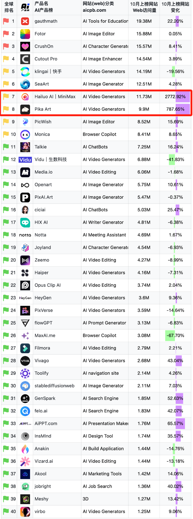 10月出海榜单中,字节的 Gauth 家庭作业 AI 帮手,登顶 10 月 AI产品榜·出海总榜第一,达 1938 万月访问量,增速 22.2%,海螺AI 海外版、Pika 在 10 月在海外增速都很快,视频生成类产品每有一个新功能,都有一波高潮。