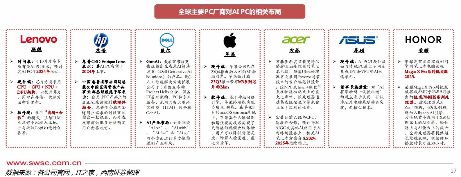 西南证券分析师王湘杰、杨镇宇11月10日研报指出,AIPC颠覆软硬件形式,AIPC将AI模型与PC结合,带来架构设计、交互方式、内容、应用生态等创新,将深入变革PC产业。当前,各PC厂商积极推动AIPC落地。其中,联想前沿布局AIPC具有先发优势,未来有望首批发布基于英特尔最先进处理器的AIPC,并预计在2024年推出AI手机和AI电脑,有望抢占更多PC市场份额。