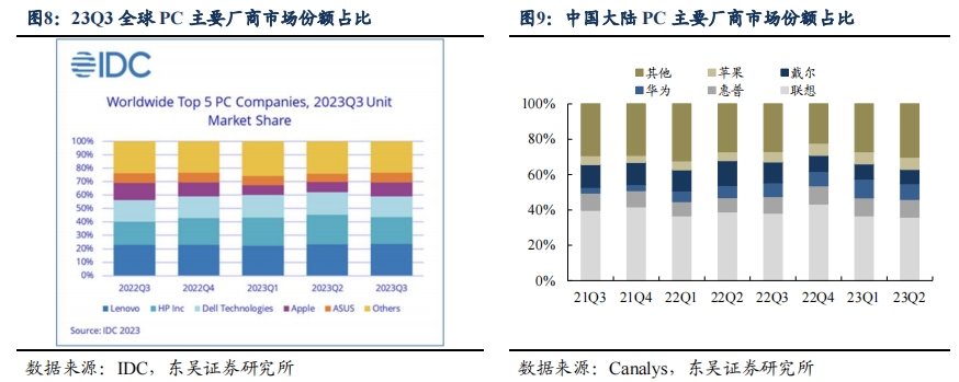 市场调查机构IDC统计数据显示,2023年第三季度全球PC出货量环比增长11%,出货量为6820万台,联想、惠普、戴尔分占品牌出货量前三名。IDC称,尽管全球经济依然低迷,但过去两个季度的PC发货量都有所增长,表明市场已经走出低谷;同时,过去几个月,PC库存也有所减少,多数渠道的库存已接近健康水平。此外,生成式人工智能可能成为PC行业的分水岭,IDC预计伴随明年大量AIPC的推出,整体销售价格将大幅提升。
