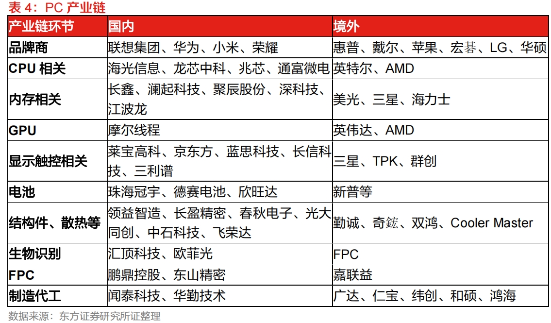 东方证券分析师蒯剑、李庭旭、韩潇锐10月25日研报认为,AI有望重塑PC市场,拉动PC需求,同时操作系统更迭与PC换机周期作用相叠加共同推动PC市场复苏,PC产业链公司有望从中受益。建议关注品牌商:联想集团;CPU相关公司:海光信息、龙芯中科;内存相关公司:澜起科技、聚辰股份、深科技、江波龙;触控显示相关公司:莱宝高科、京东方A、长信科技;电池:珠海冠宇、德赛电池、欣旺达;结构件、散热等:领益智造、长盈精密、光大同创、英力股份、中石科技、飞荣达;生物识别:汇顶科技、欧菲光;FPC:鹏鼎控股、东山精密;制造代工:华勤技术、闻泰科技等。