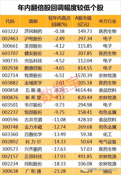 正邦科技、新五丰年内累计涨幅分别为281.27%、247.04%,这两只均为猪肉概念股。济民制药年内累计涨幅244.72%排在第4位,累计涨幅较大的还有民和股份、金力永磁、中钢天源等。在疯狂炒作之后,上述32股中有20股较历史高点回调10%以上,其中顺灏股份、美锦能源、全柴动力等回调幅度超过40%。鹏鼎控股、光弘科技、健友股份等股回调幅度不足5%,其中济民制药回调幅度最小,较历史高点差距不足1%。