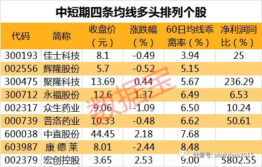 截至日前收盘,40只个股5日、10日、20日、60日四条均线近日呈多头排列。其中佳士科技、辉隆股份、聚隆科技股价与60日均线的乖离率最小,分别为3.94%、5.15%、5.67%。