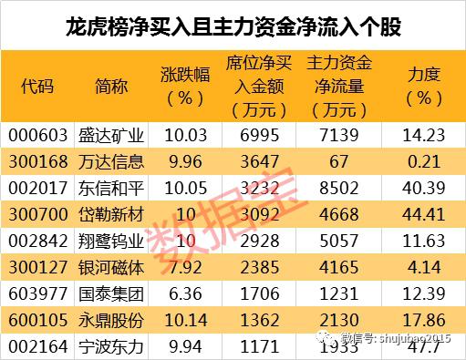 从盘口资金流向来看,主力资金净流入超千万且龙虎榜净买入个股共有9只,其中东信和平、盛达矿业、鹏欣资源等个股资金净流入金额最大。净流入力度最大的个股有友邦吊顶、宁波东力、岱勒新材,净流入力度分别为63.05%、47.7%、44.41%。