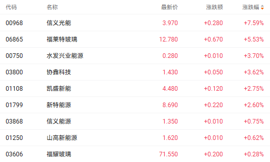 在政策预期提振下,港股光伏板块今日表现活跃。截至发稿,信义光能(00968.HK)涨7.59%、福莱特玻璃(06865.HK)涨5.53%、协鑫科技(03800.HK)涨3.62%、新特能源(01799.HK)涨2.60%。