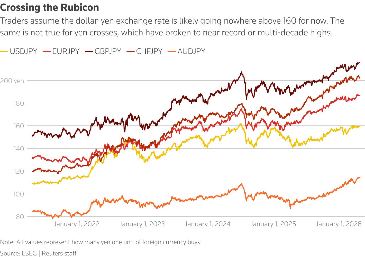 根据汇丰银行的数据,被昵称为“渡边太太”的日本散户外汇交易者当前持有自2020年2月以来最大的非美元交叉盘日元空头头寸。据悉,投资者正卖出日元兑欧元、瑞郎、英镑和澳元。当前,日元兑欧元正处于自欧元诞生以来的最弱水平,日元兑瑞郎正处于历史最低位,日元兑英镑处于全球金融危机以来新低,日元兑澳元则处于30年来最弱水平。