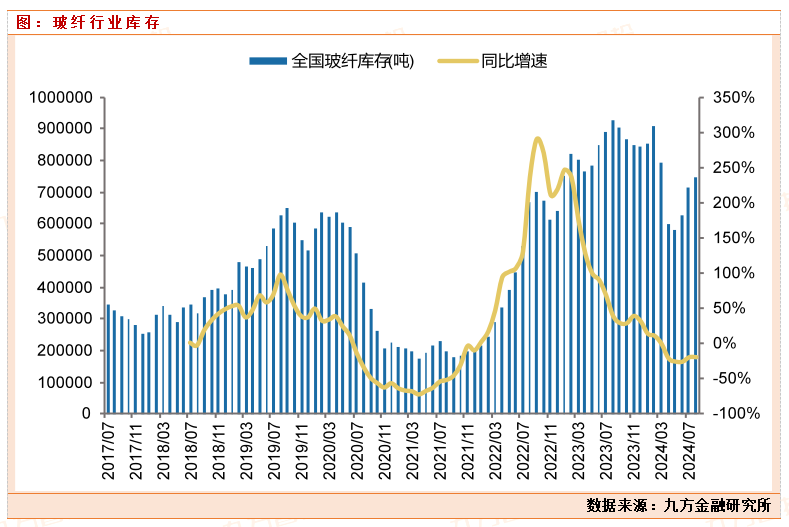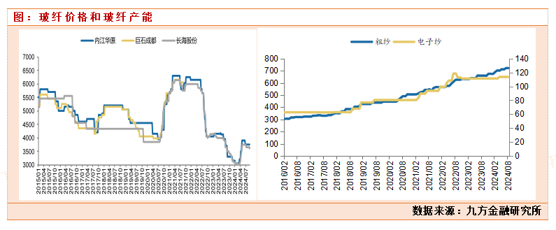 今年以来因为房地产行业需求的持续下滑,同时国内经济复苏低于预期,玻纤价格持续下跌,最低粗纱价格跌破3000元/吨,跌破全行业成本价格,全行业陷入亏损。到3 月底,多家头部企业接连发布涨价函,玻纤价格企稳反弹,其中粗纱价格反弹至 6 月底后小幅回调,电子纱价格高位暂稳。截至 2024 年9 月20 日,全国 2400tex 缠绕直接纱/G75 电子纱均价 3675/9200 元/吨,同比+10.4%/+16.5%,目前玻纤的价格相对6月分的高点3800元/吨,有小幅下滑。玻纤行业库存74.5万吨,相对去年高点80万吨,是下降的,但相对今年一季度的60万吨,行业库存增加,增加的主要原因还是因为三级以来是房地产建材行业的传统淡季,夏季较为炎热,建材施工减少,造成行业库存有所增加。目前美国降息50个基点,美国正式进入降息周期,利好全球经济,对于国内来说,今年以来经济数据持续低于预期,房地产基建等数据更是下滑严重,美国的降息对国内经济有着很重要的意义。国内降息降准政策已经在路上,我们预期在10月份以后,我国会跟着出台降息降准政策,来救助国内目前低迷的经济形势。房地产政策方面,市场普遍预期会在10月份出台降低存量房贷款利率等政策。我们预期国内经济有望在四季度开始触底回升,房地产基建等销售,开工数据会逐步好转,从而带动玻纤的需求,带来行业库存的下降,带动玻纤价格上行。