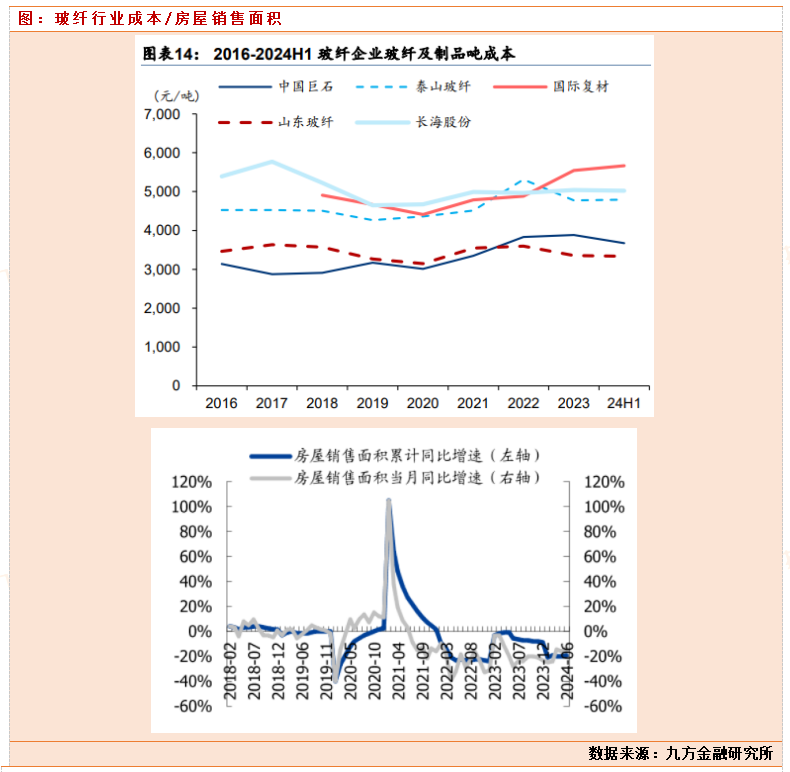 玻纤价格和玻纤行业库存成明显的负相关关系,因为玻纤整体的行业产能过剩,玻纤的价格受到下游需求端影响较大,玻纤的下游较为分散,涉及行业较多,经济的景气度影响着玻纤的需求,需求影响行业库存,可以通过观察行业的库存,可以判断下游需求的景气度,来预测玻纤价格的趋势。今年以来国内经济持续低于预期,房屋销售面积持续下滑,同比有10%左右的下滑。竣工面积,新建面积都有较大幅度的下滑。同时国内制造业数据表现也是低于预期,工业增加值PMI连续4个月低于50,最近8月份PMI更是创新新低49.1。三季度以来,经济持续的低迷,造成玻纤行业库存持续累库。目前玻纤行业好消息是,美国开始降息周期,美国9月19日,宣布降息50个基点,利好全球经济,中长期可以拉动玻纤的全球需求。同时国内方面,大概率会在10月份开始降息降准,房地产这块也会出台更大的刺激政策,比如降低存量房贷款利率等。