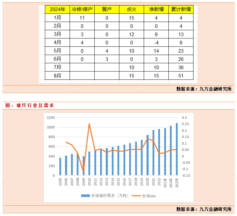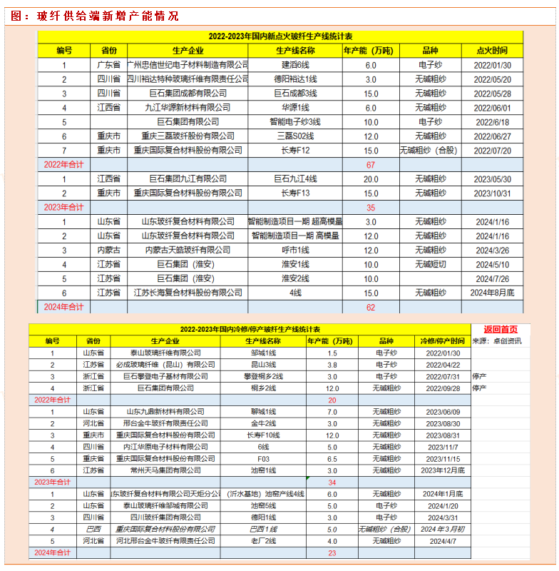 玻纤目前的供给端,今年新增产能较多,主要在建集中在中国巨石,山东玻纤,长海股份这三家的在建,机构统计预期今年在建投产62万吨,行业供给增速在6.8%左右。到2024年年底,全球玻纤产能在1000万吨左右。全球玻纤需求量在980万吨左右,整体玻纤行业产能是过剩的。今年是行业扩产大年,但是2025年开始,行业将没有新增产能。今年24Q1 以来,随着价格及盈利恢复,部分前期已基本建设完成的产线陆续点火,但新增供给仍集中于龙头企业,其中中国巨石淮安两条年产各 10 万吨产线分别于 5 月和 7 月点火,长海股份 15 万吨产线于 9 月点火。造成玻纤价格压制,但是四季度后,今年在建投产产能开始减少,玻纤价格有望企稳。据卓创资讯,截至 8M24,全国玻璃纤维池窑在产产能 718.8 万吨,同比+3.9%, 供给端格局保持相对稳定且龙头份额继续提升,中国巨石、泰山玻纤、重庆国际国内在产产能分别为 253、120、89 万吨,CR3 达 64%,相比 23 年底+2pct。