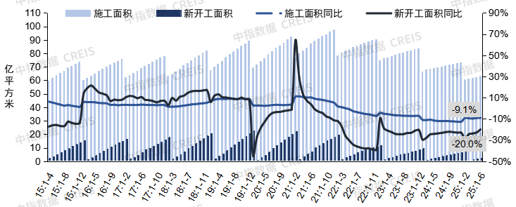 房屋施工面积:1-6月,全国房屋施工面积为63.33亿平方米,同比下降9.1%,降幅比1-5月收窄0.1个百分点;其中,住宅施工面积为44.12亿平方米,同比下降9.4%。