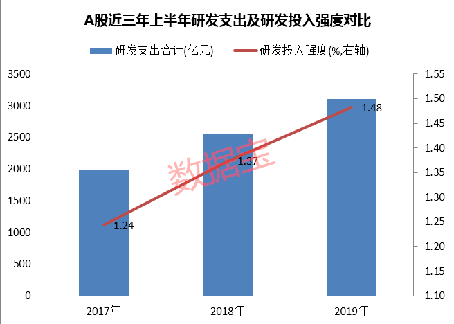 证券时报·数据宝统计显示,今年上半年以来,剔除7月份以来上市新股,A股上市公司研发支出合计金额达3107.84亿元,较去年同期增长21.51%,是近三年来同期最高水平。同时,研发投入强度(研发支出/营业收入,剔除银行板块)稳步上升,2019上半年研发投入强度达到1.48%。