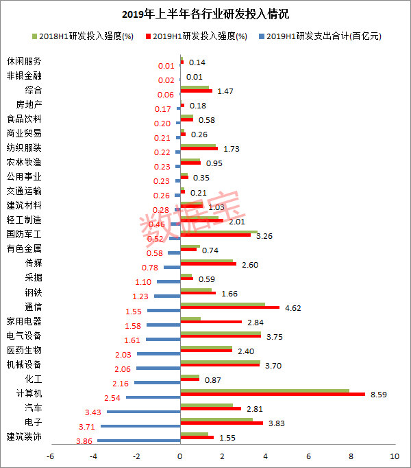 分行业来看,数据宝统计显示,12个行业上半年研发支出合计超百亿。建筑装饰行业以385.91亿元居首,其次的电子、汽车行业研发支出均超300亿;另外,计算机、化工、机械设备及医药生物行业的研发支出均超过200亿元。与此同时,休闲服务、非银金融、综合行业的研发支出均不足10亿元。