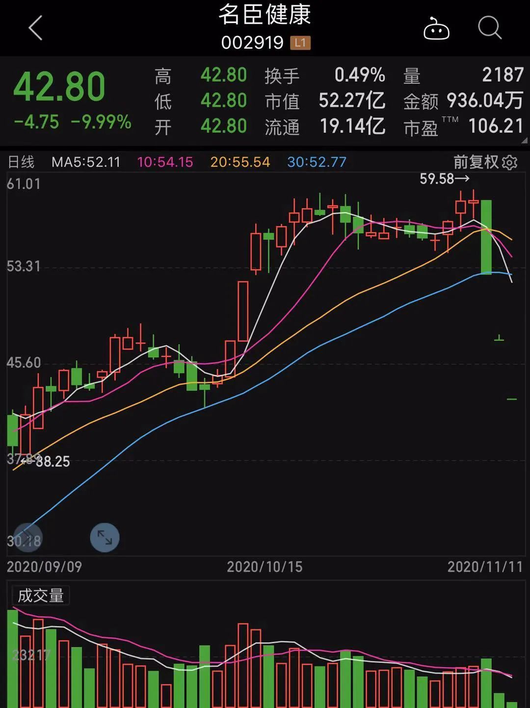 昨日早间开盘,名臣健康被牢牢封死在跌停板上。自上周五触及股价历史高点以来,名臣健康已经连续三天跌停,股价跌破60日均线,总市值缩水近三成。公司昨日晚间紧急发布股票交易异常波动公告,表示业绩并未发生重大变化,经过自查目前并没有任何应予以披露而未披露的事项。
