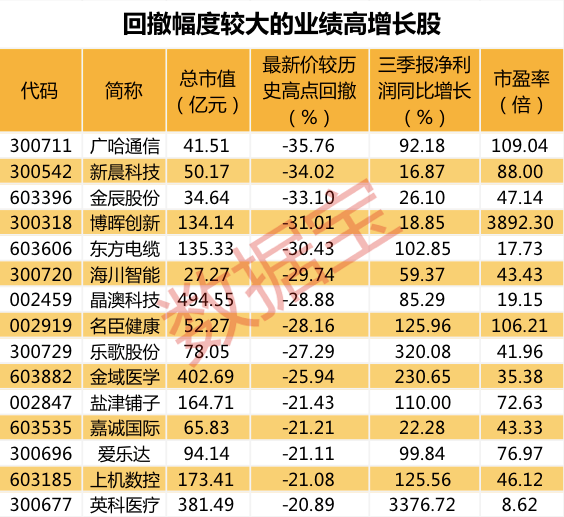证券时报·数据宝统计显示,剔除掉两年内上市的次新股,近一个月股价创历史新高的个股中,三季报业绩高增长且近期回撤幅度超过20%股共15只,其中5只个股回撤幅度超过30%。广哈通信、新晨科技、金辰股份回撤幅度居前。