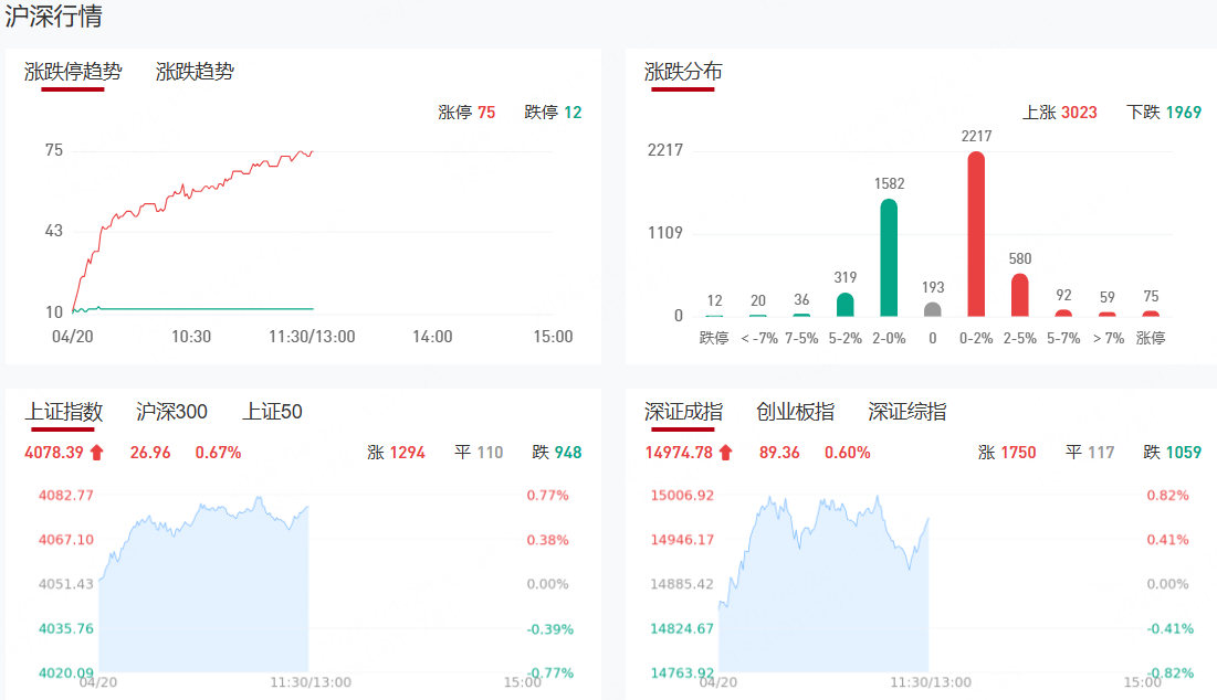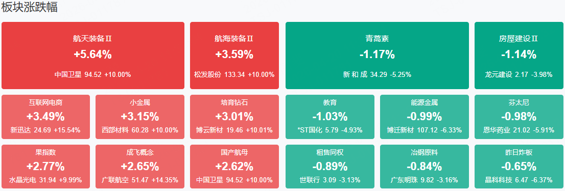 市场早盘震荡拉升,沪指、深成指均涨超0.5%,创业板指再度翻红,北证50指数盘中超3%。沪深两市半日成交额1.71万亿,较上个交易日放量1254亿。盘面上热点快速轮动,全市场超3300只个股上涨。从板块来看,商业航天概念表现活跃,中国卫星、西部材料、中衡设计、有研复材涨停。光纤概念快速拉升,通鼎互联3天2板,中天科技涨停。液冷服务器概念走强,英维克触及涨停,创历史新高,康盛股份7天4板。玻璃基板概念延续强势,沃格光电走出8天5板,续创历史新高,彩虹股份2连板。下跌方面,医药板块走势较弱,科拓生物、恩华药业、海森药业等纷纷下挫。